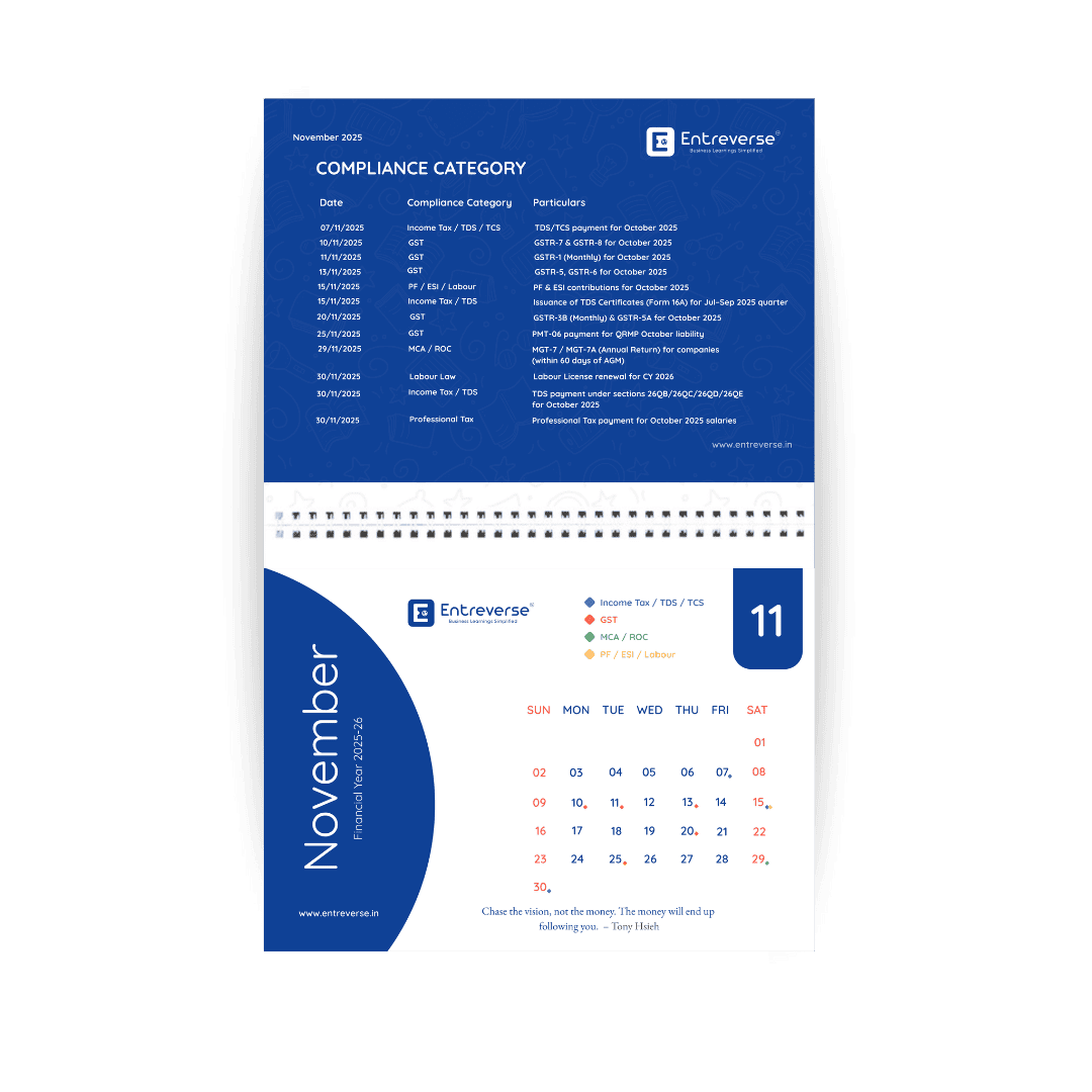 The EntreVerse Compliance Desk Calendar (FY 2025-26) ends that anxiety. Month by month, every compliance requirement for Indian businesses is mapped clearly. One glance, and you know what must be done, when it must be done, and how to stay in control.